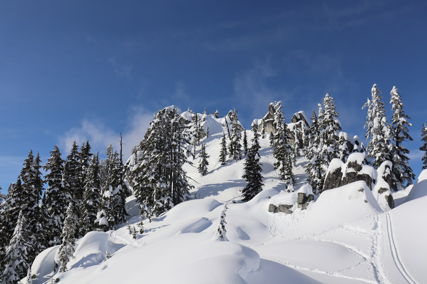The ascent on this showshoe hike is relentless, but the views are spectacular, especially if you push past the lake a bit further on up to the “rock garden”.